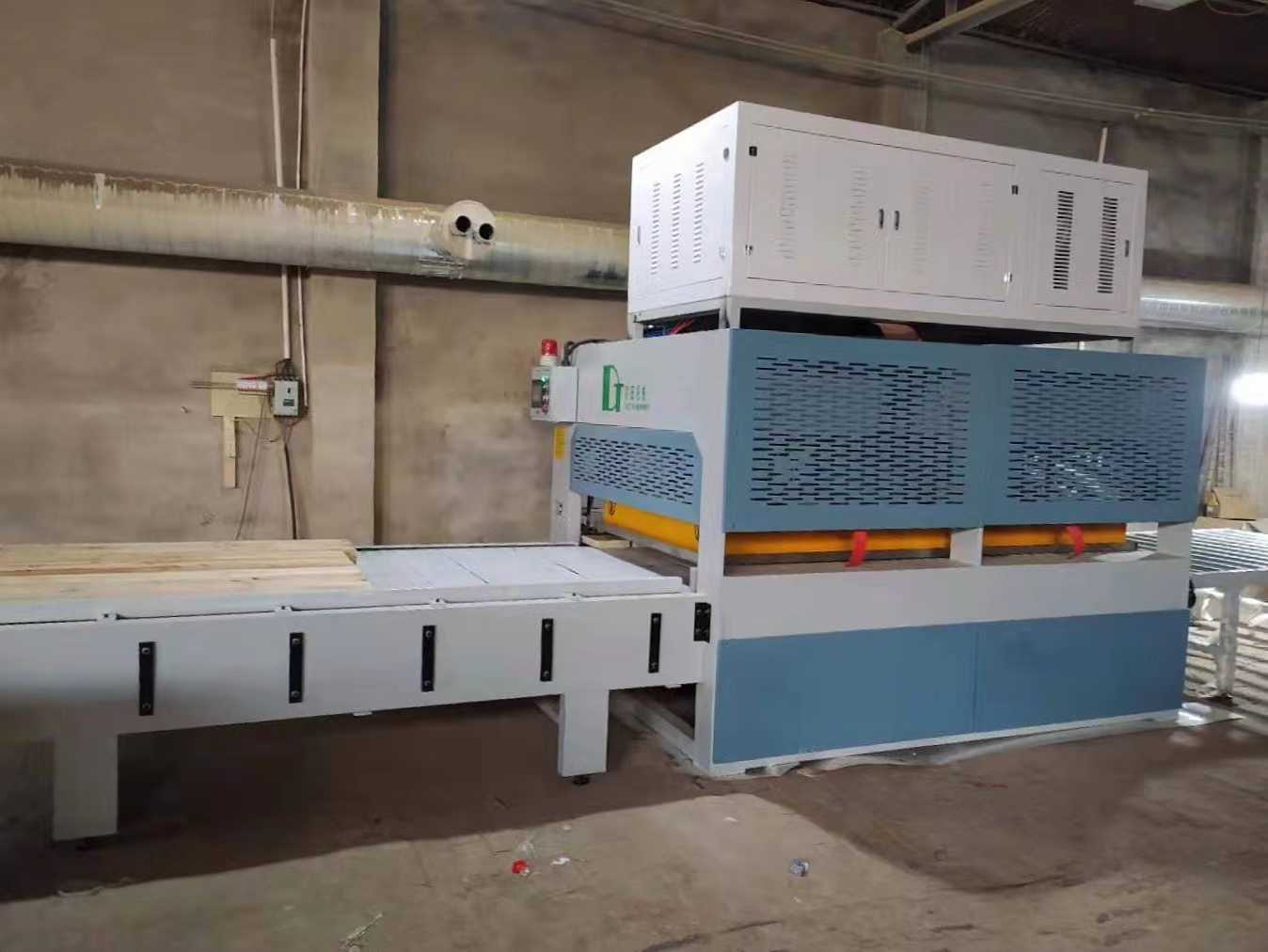 2、輸送帶自動送出料,可拼接無限長板材,省時省力。